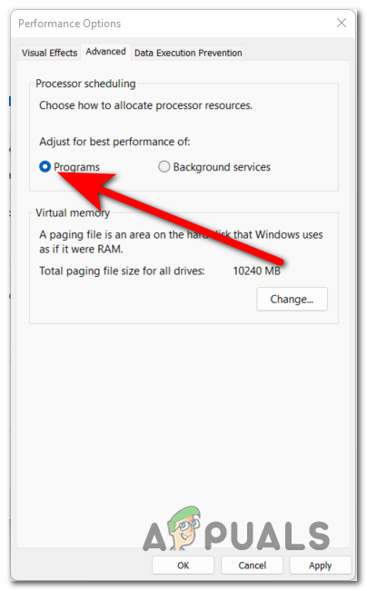 Making sure that the Programs option is selected - After that, right after Virtual memory, you have to click on the Change button. Now make sure that the Automatically manage paging file size for all drivers option is activated, meaning that the box next to it is checked.