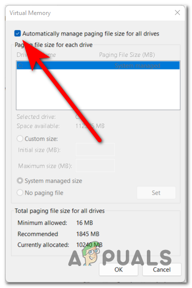 - The paging file is not enabled – As it turns out, another reason why you might expect to deal with this issue is a scenario in which the Windows Paging file is disabled and your Windows computer is not automatically permitted to manage the file size. To resolve this issue, you’ll need to enable the paging file from the Virtual Memory tab and restart the File Explorer service.