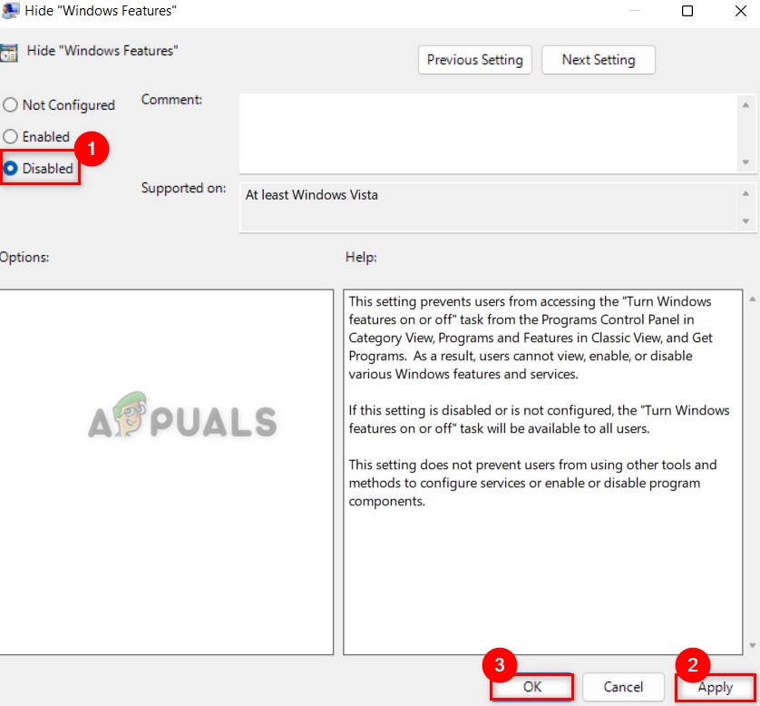 Double-click Hide “Windows Features” option - In the Hide Windows Features window, Select the Disabled radio button and click Apply and OK.