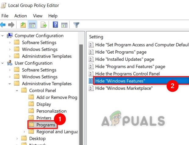 User Configuration > Administrative Templates > Control Panel > Programs - Make sure Programs is selected on the left panel and double-click on Hide “Windows Features” option present on the right side of the editor as shown below.