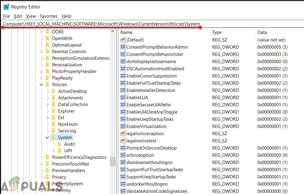 Computer/HKEY_LOCAL_MACHINE/Software/Microsoft/Windows/CurrentVersion/Policies/System