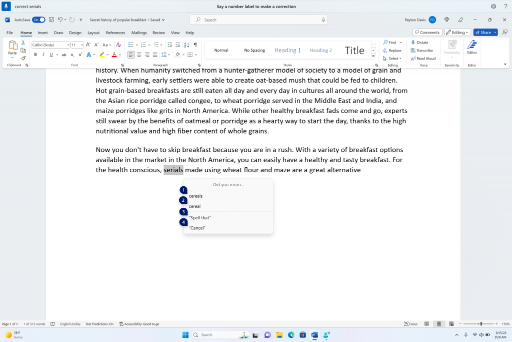 You can say “correct [text]” or “correct that” to correct a specific piece of text or last dictated text. The correction window appears with a list of options labelled with numbers.