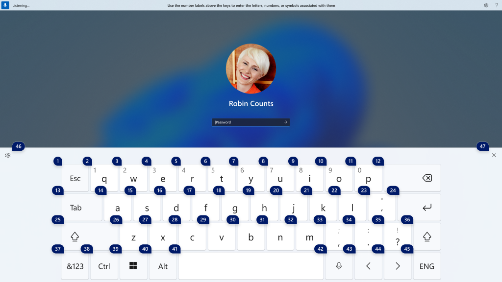 You can follow the instructions on the voice access bar to get your focus on the password field and use your voice to dictate your password or PIN. Alternatively, you can say “show keyboard” to bring up the touch keyboard with number labels on it. You can say the numbers on the keys to enter the letters associated with it. This will mask the actual password you are entering from being heard by anyone in your vicinity.