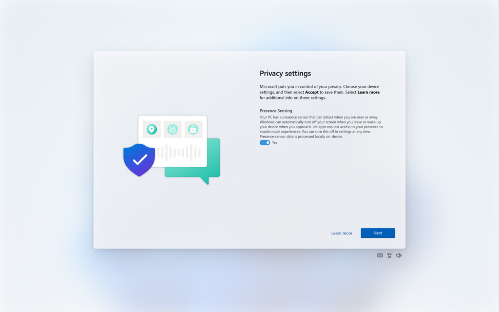 Wake on Approach, Lock on Leave, Adaptive Dimming are all powered by Presence Sensing in Windows and now can be enabled via the OOBE (“out of box experience”) setup process when choosing your privacy settings for your device. This will give more control of the presence sensing features and app access to presence information when setting up a new device with a compatible sensor.