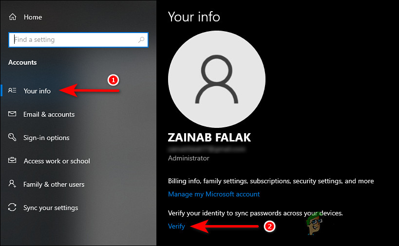 Access Account settings - Now select Your Info tab and then click on Verify under You need to verify your identity on this PC.