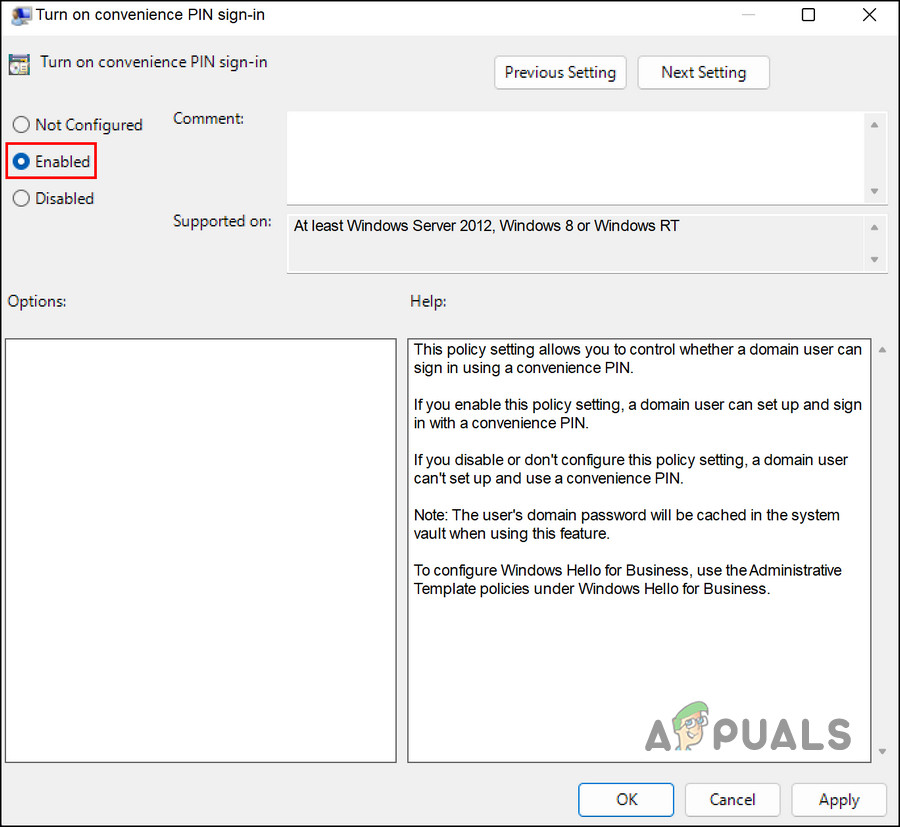 Enable convenience PIN sign in - Choose Enabled and then select Apply > OK to save the changes.