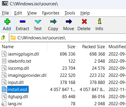 Opening ISO in 7-Zip - Navigate to the sources folder within the Windows ISO and locate the install.esd file.