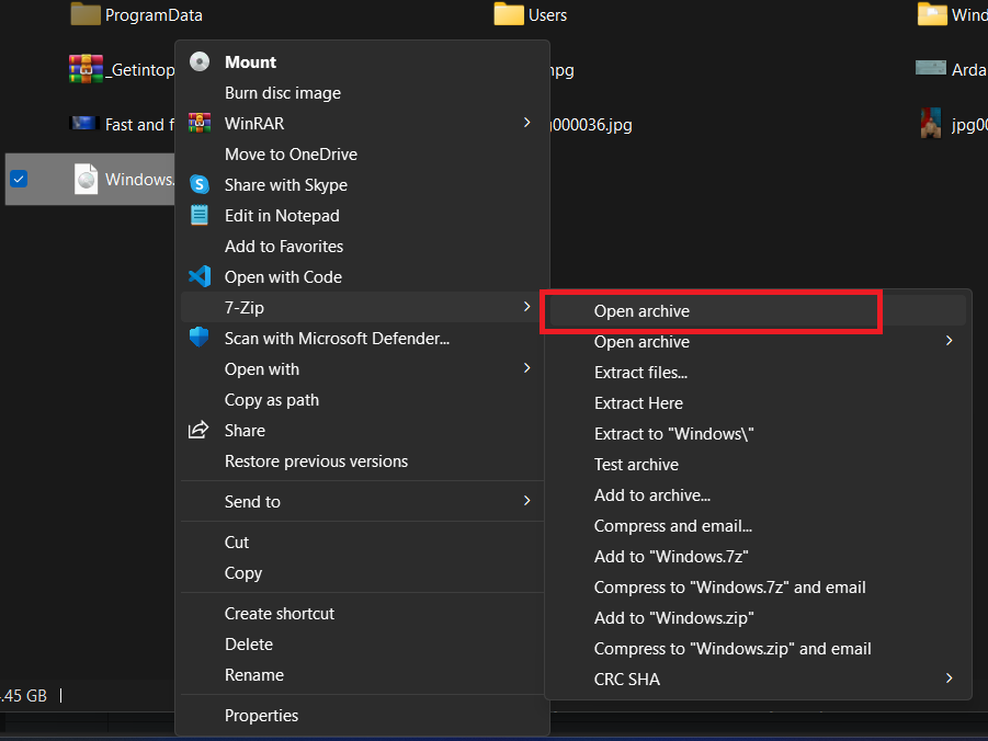 - Right-click on the downloaded ISO file and select Open Archive using 7-Zip.