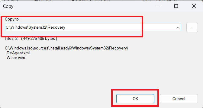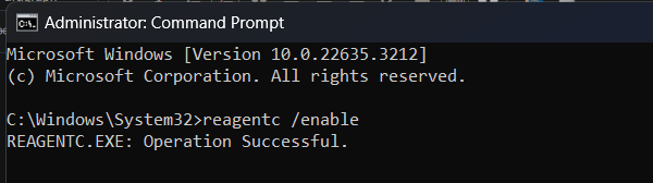 - If step 9 fails, open Command Prompt as Administrator and execute the following command to copy the Winre.wim file to the recovery folder.