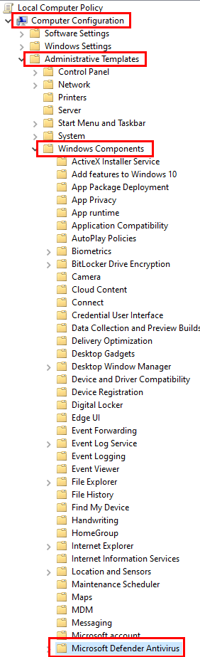 - Navigate to Computer Configuration > Administrative Templates > Windows Components > Microsoft Defender Antivirus.
