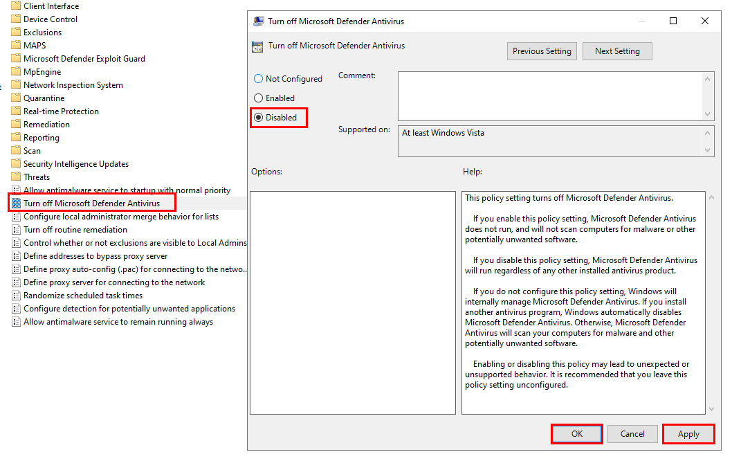 - Double-click on Turn off Microsoft Defender Antivirus and set it to Disabled if it is not already.