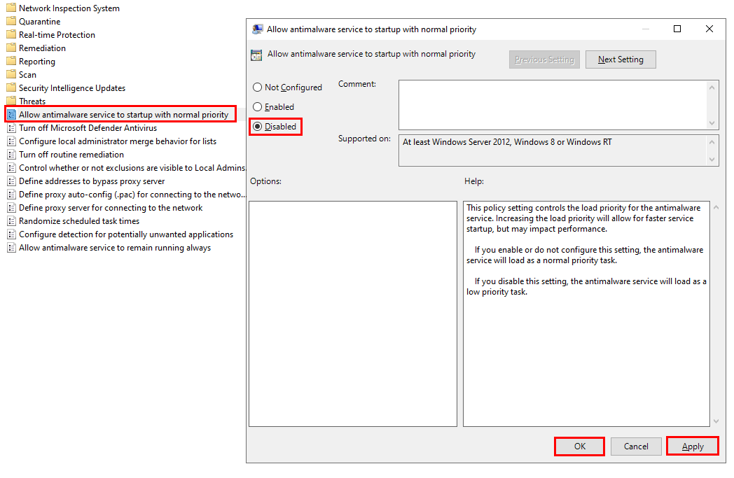 - Double-click on Allow Antimalware Service to start with normal priority and ensure it is set to Disabled as well.
