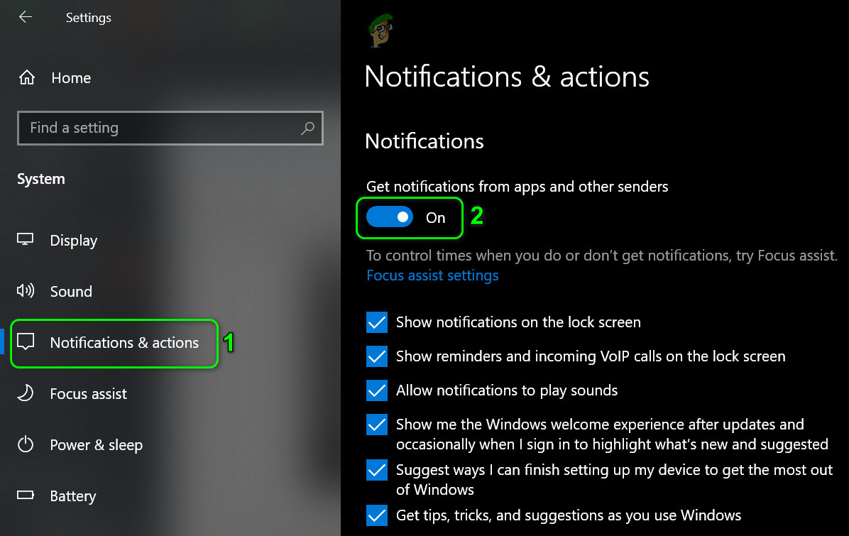 - Then, in the right pane, toggle the switch of “Get Notifications from Apps and Other Senders” (under Notifications) to on position.
