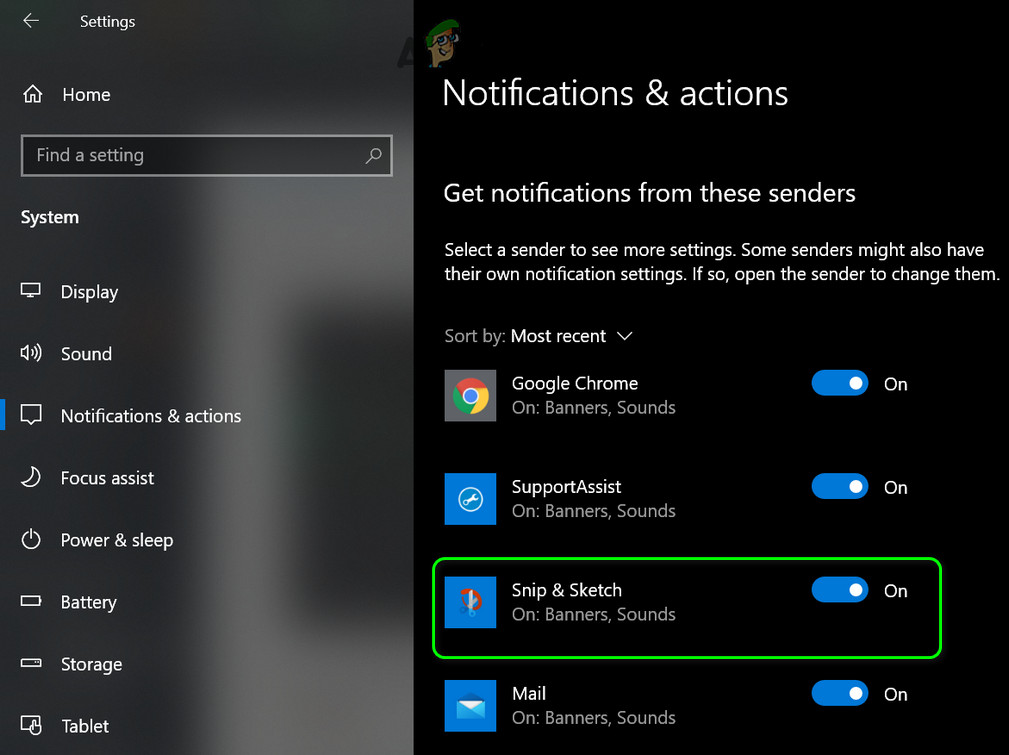Enable Notifications from Apps and Other Senders - Now, scroll down and under the Get Notifications from These Senders, make sure Snip & Sketch is enabled.