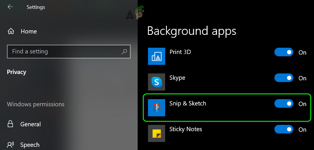 Open Background Apps - Now make sure that the Snip & Sketch is allowed to operate in the background and then check if the shortcut issue is resolved.
