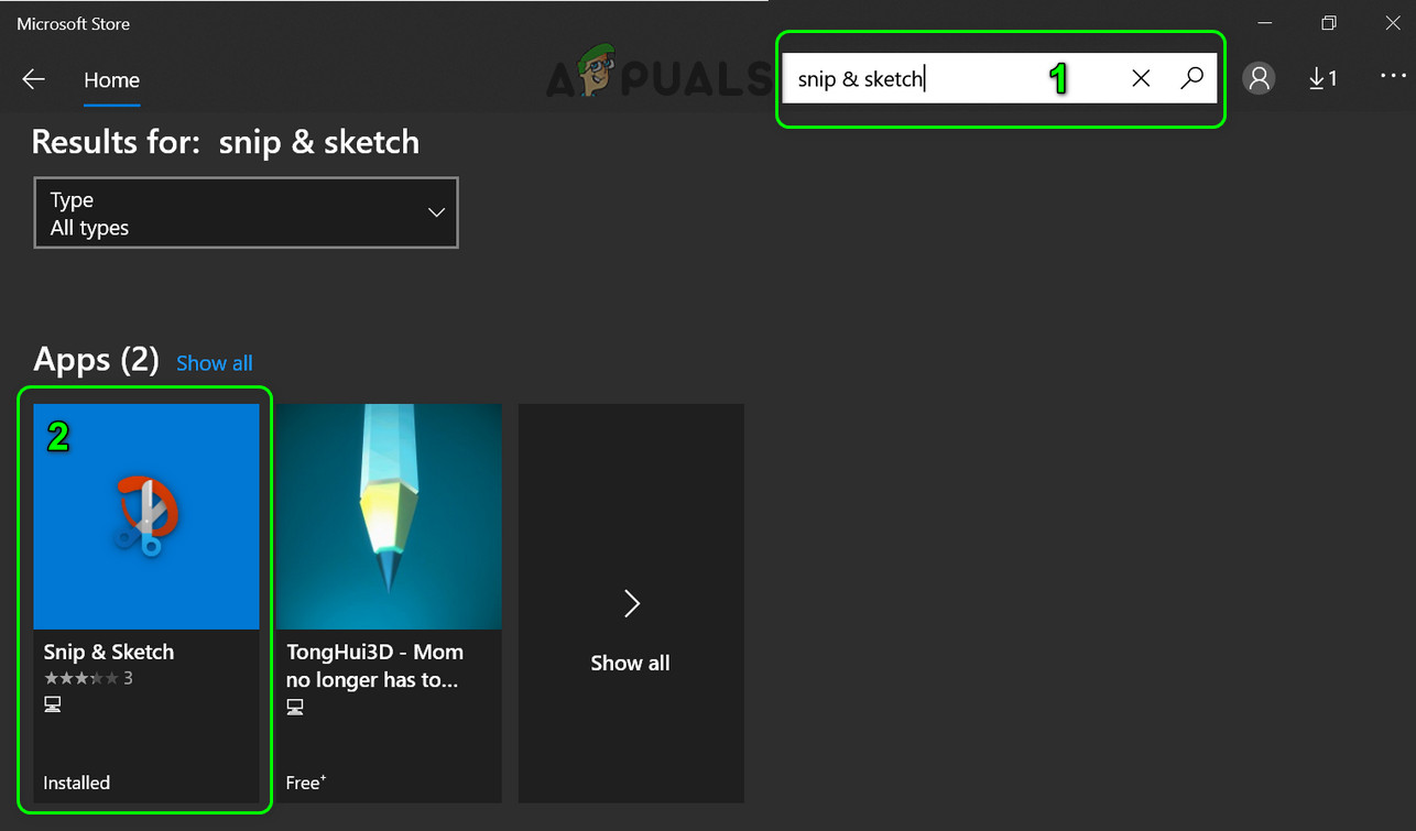 - If not, then launch Microsoft Store and search for Snip & Sketch in the search bar (near the top right of the window).