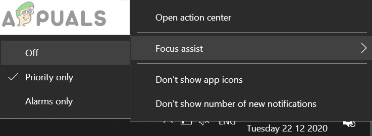 - Right-click on the Action Center icon in the system’s tray (on the right of the system’s clock) and select Focus Assist (in the menu shown).