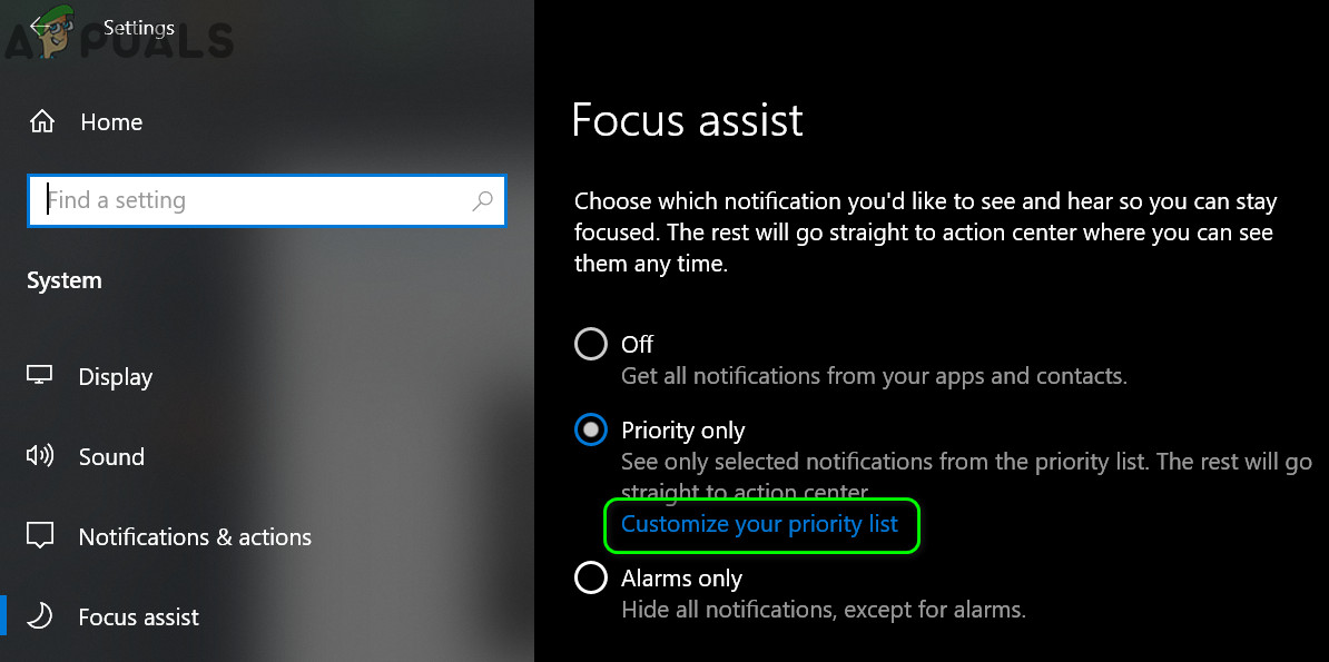 - Now select Go to Settings and then click Customize Your Priority List (in the Priority Only option), even if you have turned off the Focus Assist.