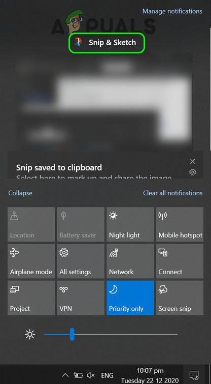 - Take a screenshot using the shortcut and click on the Action Center icon to check if the screenshot is shown in the notifications (you may have to clear other notifications till the notification from Snip & Sketch is shown).