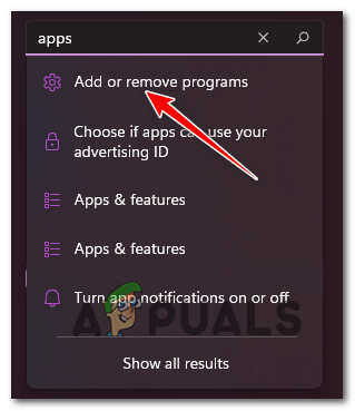 - Once you’re inside the root directory of the Settings menu, use the search function in the top-left corner to search for ‘apps’, then click on Add and Remove Programs from the suggestion context menu.