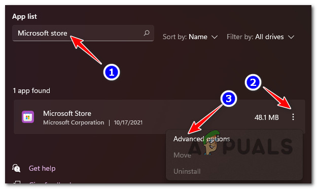 - Next, from the list of results, click on the action button associated with Microsoft Store and select Advanced Settings from the context menu.
