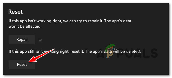 Generally, if the root cause of the 0x803F8001 error is caused by temporary file data or a corrupted dependency, the way to fix both is to initially try and repair the entire suite before moving down to a reset procedure.