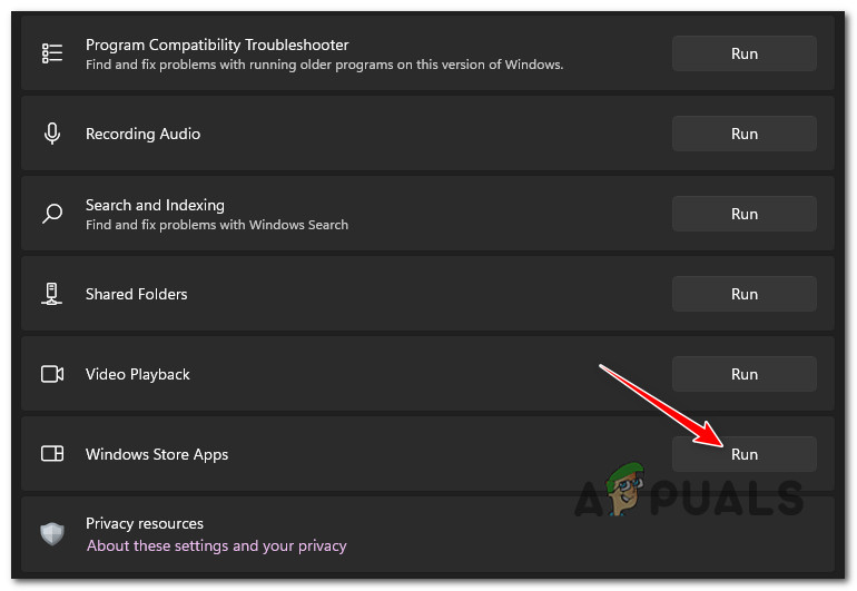 Open up the other troubleshooter first - Once you’re inside the Other Troubleshooters page, scroll down to the bottom of the screen and click on the Run button associated with Windows Apps Troubleshooter (under Others).