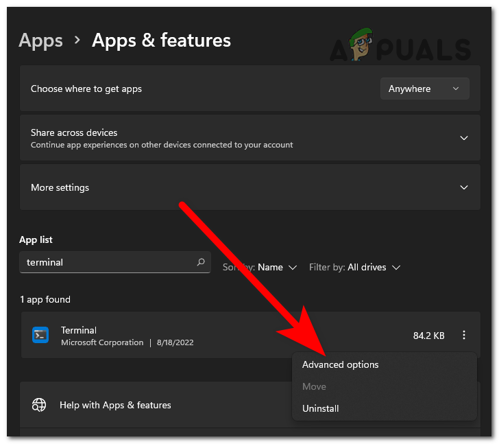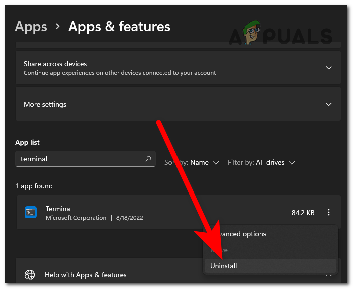 Inside the Windows Settings accessing the Apps & features section - Now that you are able to see all the apps that are installed on your computer, locate the Terminal application using the search option or manually.