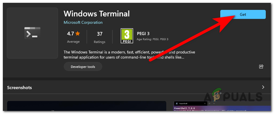 Accessing the Windows Terminal page inside the Microsoft Store - When you are inside the Windows Terminal page, click on the Get button located in the top left corner to install the app.
