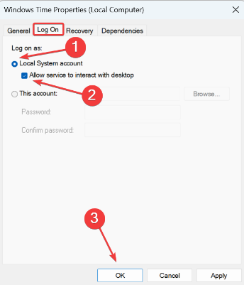 - Go to the Log On tab, select the Local System Account option, check the box for Allow the service to interact with desktop and hit OK.