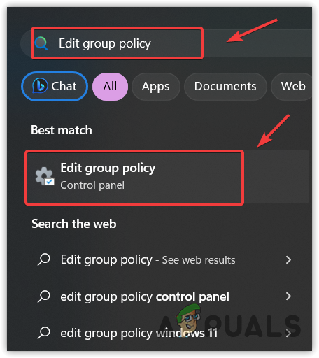 - Click the Start Menu and type Edit group policy.