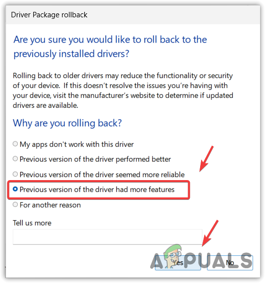 - Select any reason why you are rolling back. Then, click Yes to install the previous driver.