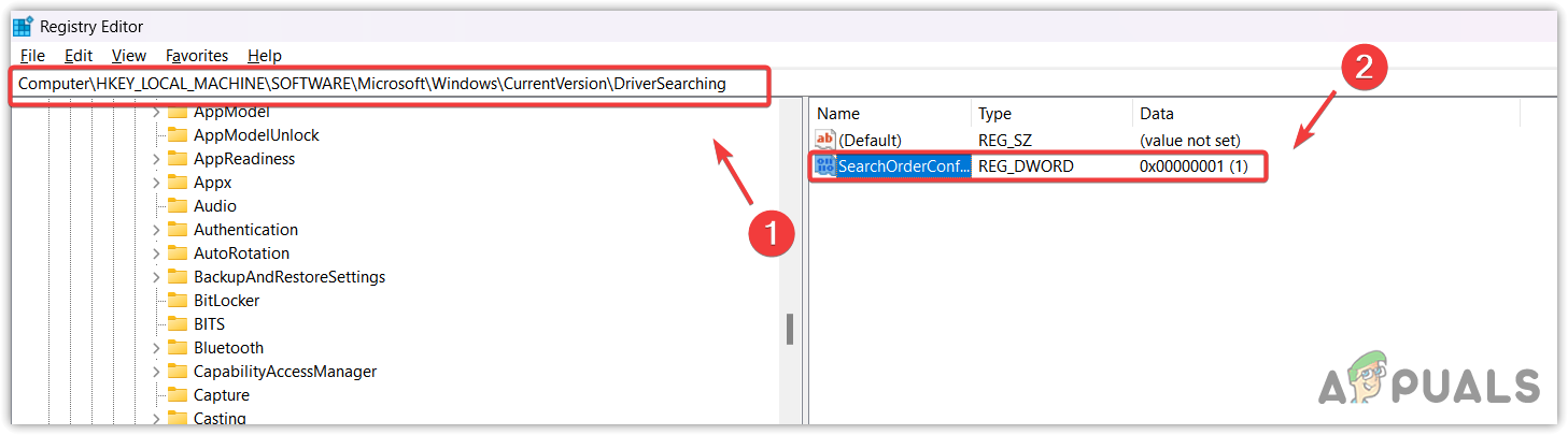 - Double-click the SearchOrderConfig and change its value data to 0 to dsiable the driver updates.