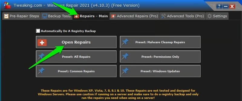 - Open Windows Repair, select the Repair – Main tab, and click on Open Repairs.