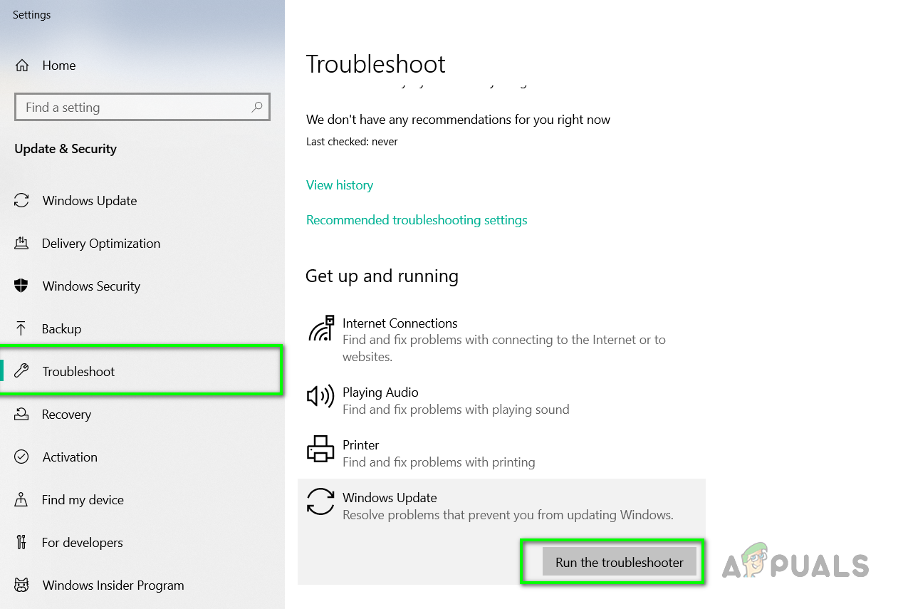 In this method, we will use the Windows built-in Troubleshooter to automatically fix the errors that might keep you from updating your Windows. This tool tries to find out any changes made by other applications that might have a system restart pending or if a certain service is crashed and needs to be restarted.