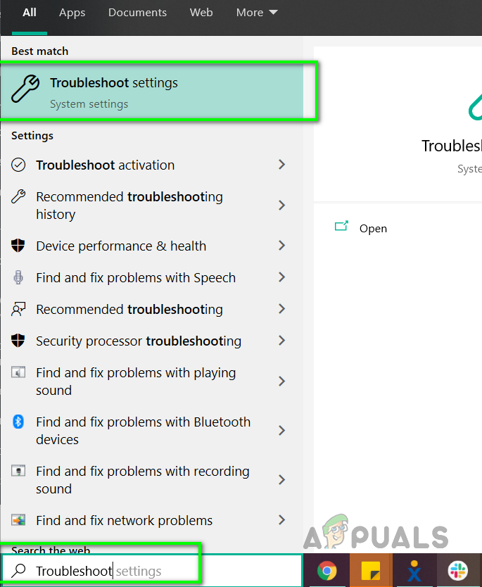 - Click on Windows Menu and Type Troubleshoot in the Search Box and click on Troubleshoot Settings