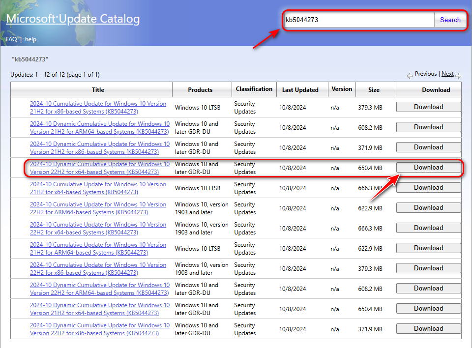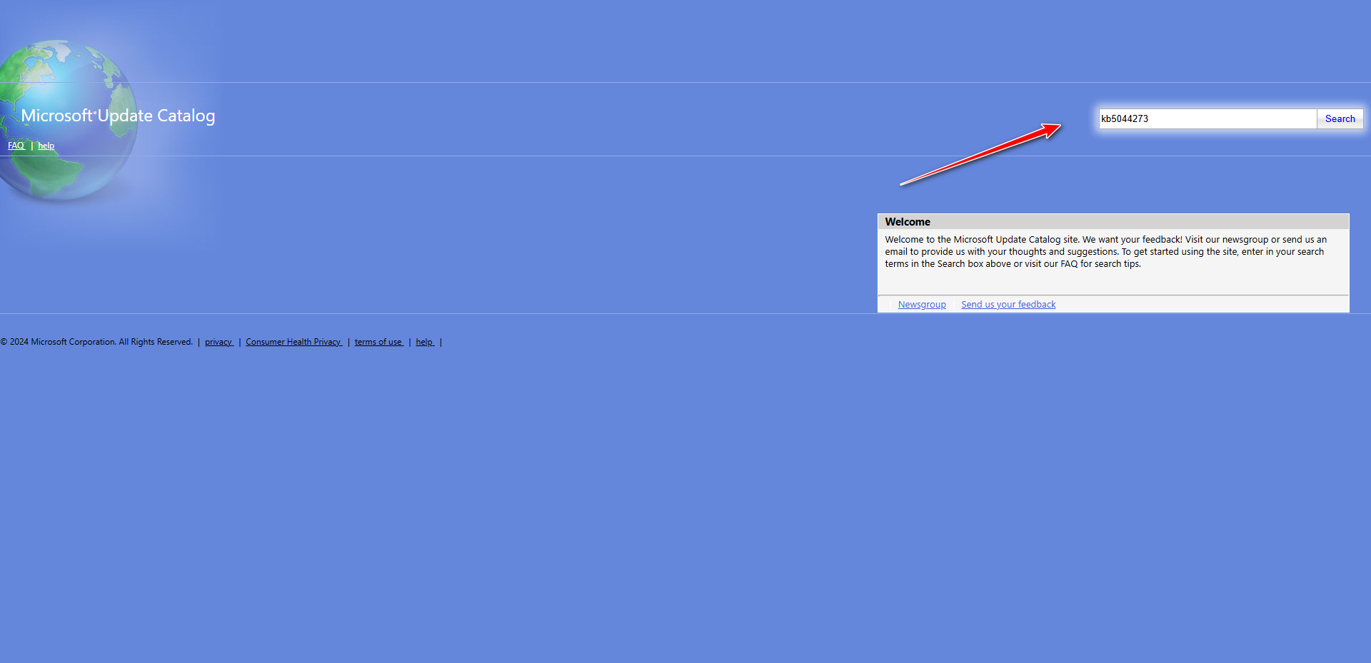 - Go to the Microsoft Update Catalog, search for the update in the search bar. In our case, it’s “KB5044273”.