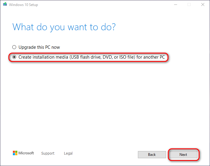- In the next step, choose Create installation media (USB flash drive, DVD, or ISO file) for another PC and click on next.