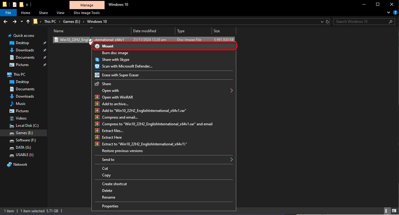 - Once the ISO is downloaded, right-click on the ISO file and click on mount.