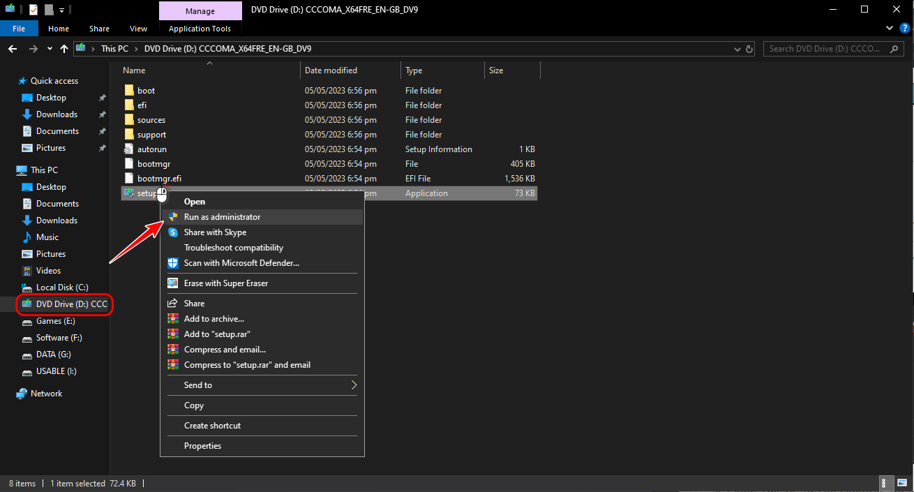 - Open This PC or File Explorer, go to the new virtual drive, and double-click on setup.exe to begin the repair process.