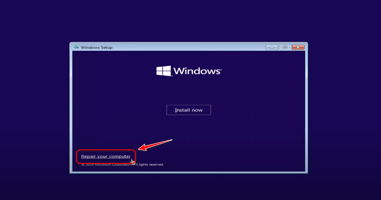 - When the Windows Setup screen appears, select Repair your computer (don’t click on “Install now”).