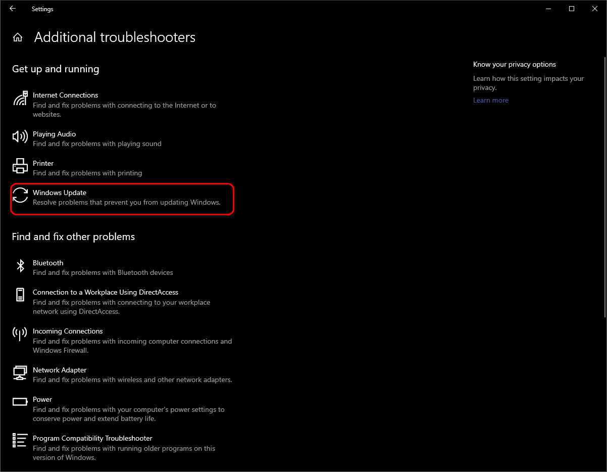 - Go to Update & Security > Troubleshoot > Additional Troubleshooters.