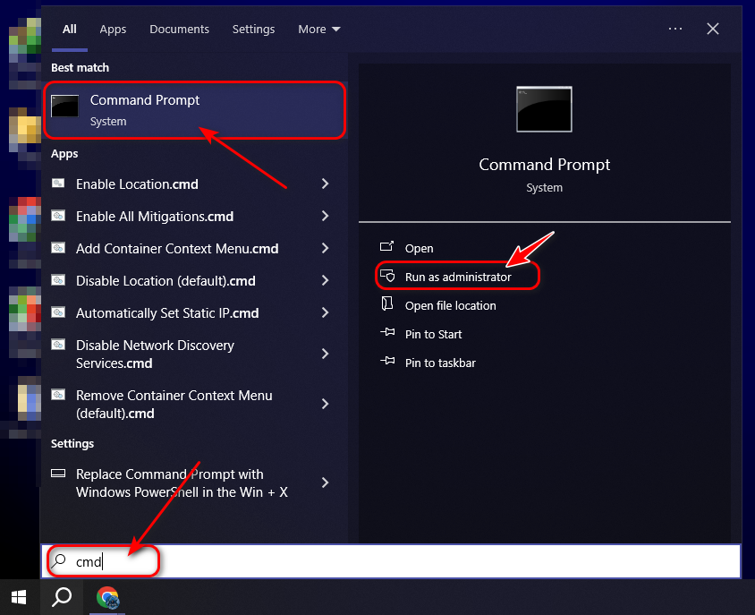 - To open Command Prompt as an administrator, click the Windows start button and type “CMD”.
