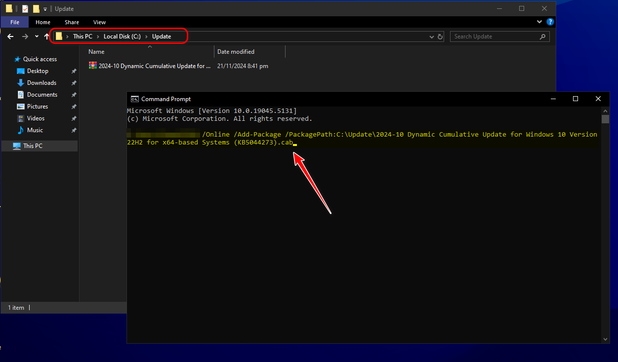 DISM /Online /Add-Package /PackagePath:C:\Update\filename.cab