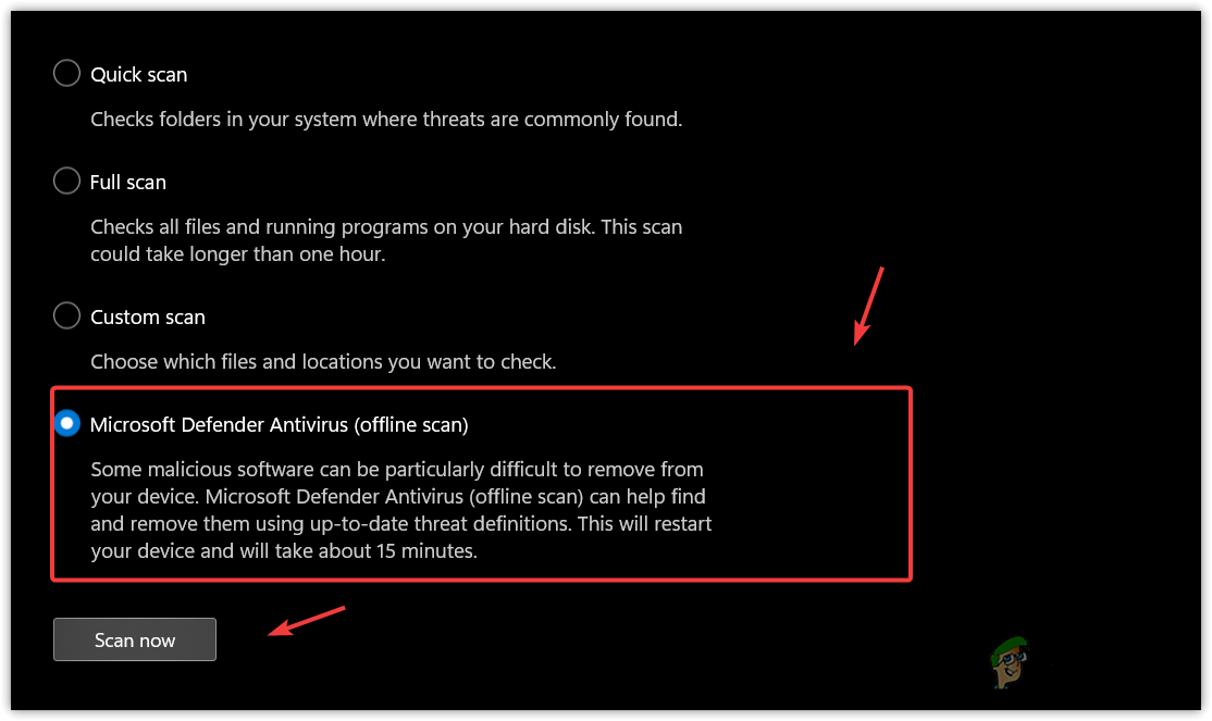 - Here select Microsoft Defender Antivirus (Offline scan) and click Scan Now. This will scan your system in the Windows recovery environment, so your PC will restart when it is finished.