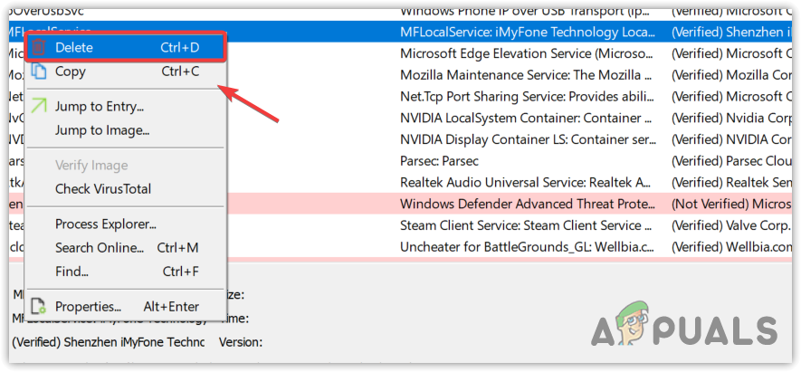 - Here find the Winservice.exe and right-click on it and select Delete.