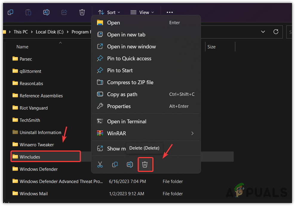 - Here locate the Wincludes folder, right-click on it, and delete it.