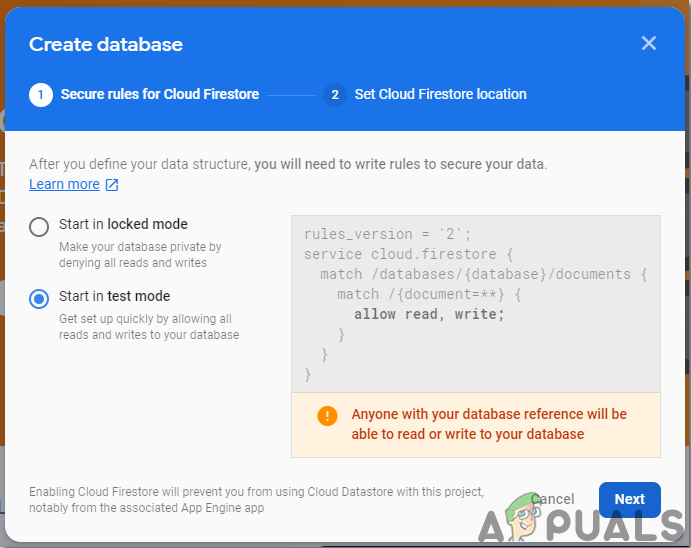 8. A menu will appear asking to set the mode of your database. Click on test mode and then click Enable.