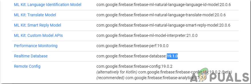 11. One thing that you need to do other than connecting the firebase, is to update the database version. For that, click on go to docs. Now click on guides and select Android Guides from the list that appears on the screen. Scroll down until a table appears. Look for Real-Time Database in that table and find its version. in my case, it is 19.1.0