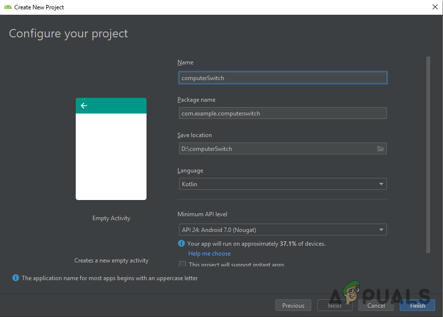 2. Now name your project as computerSwitc, select Kotlin as language, and select the minimum API level according to your mobile phone.